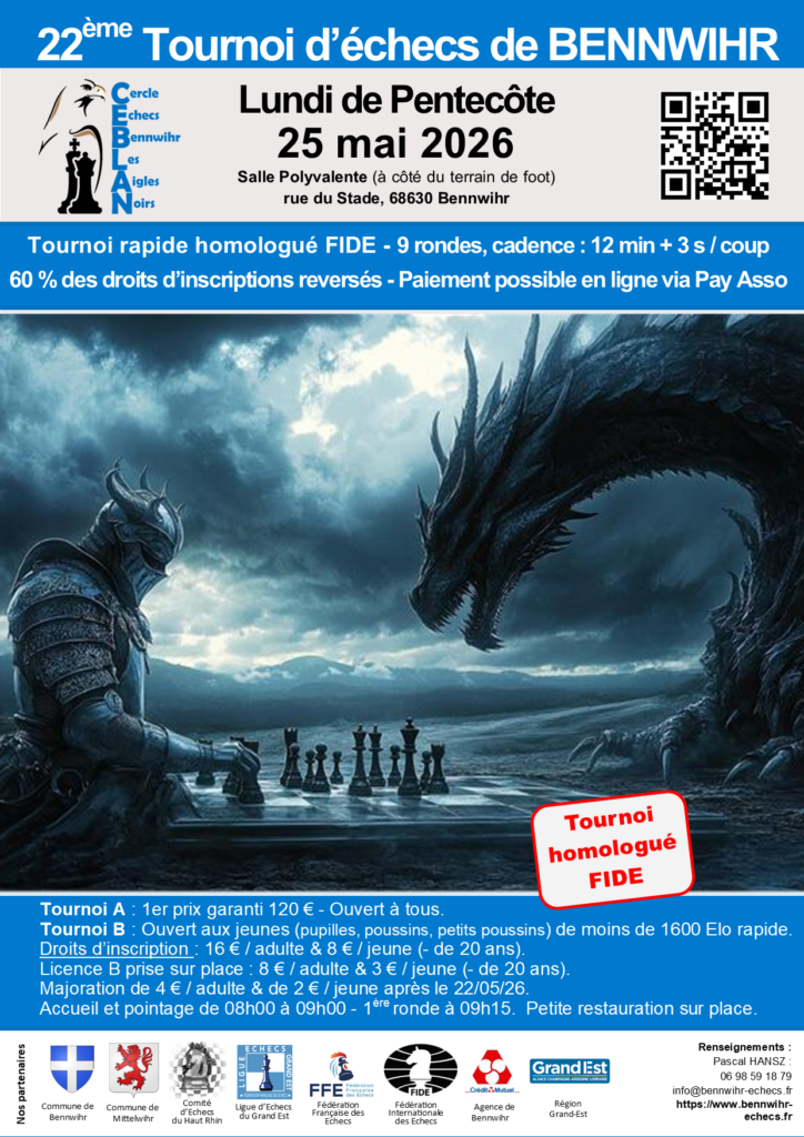 Le Cercle d’Echecs de Bennwihr Les Aigles Noirs vous invite à son 21ème tournoi d’échecs de Bennwihr le Lundi de Pentecôte 25 mai 2026